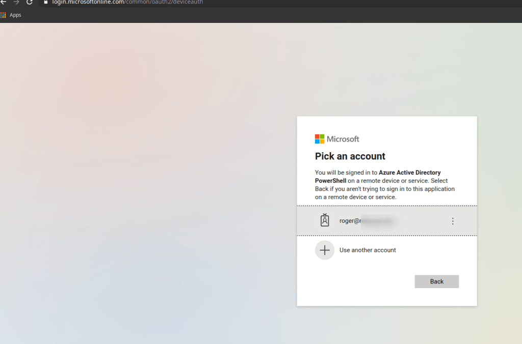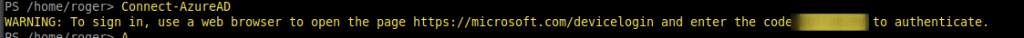 Then we open a browser and surf to https://microsoft.com/devicelogin and put in the code that you receive from above command.