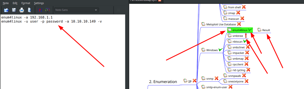 What I did was like this. We Enumeration phase then we go into Windows and for example enum4linux. When you choose enum4linux you get notpad function. there you put in the commands that you like. A green tickbox for me is that tha command was ok and we got a result. Child object of enum4linux.
