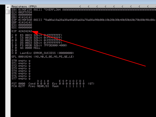 It is time to verify our offset with above script. To see that our EIP is BBBB. If it is we can now control the return adress: