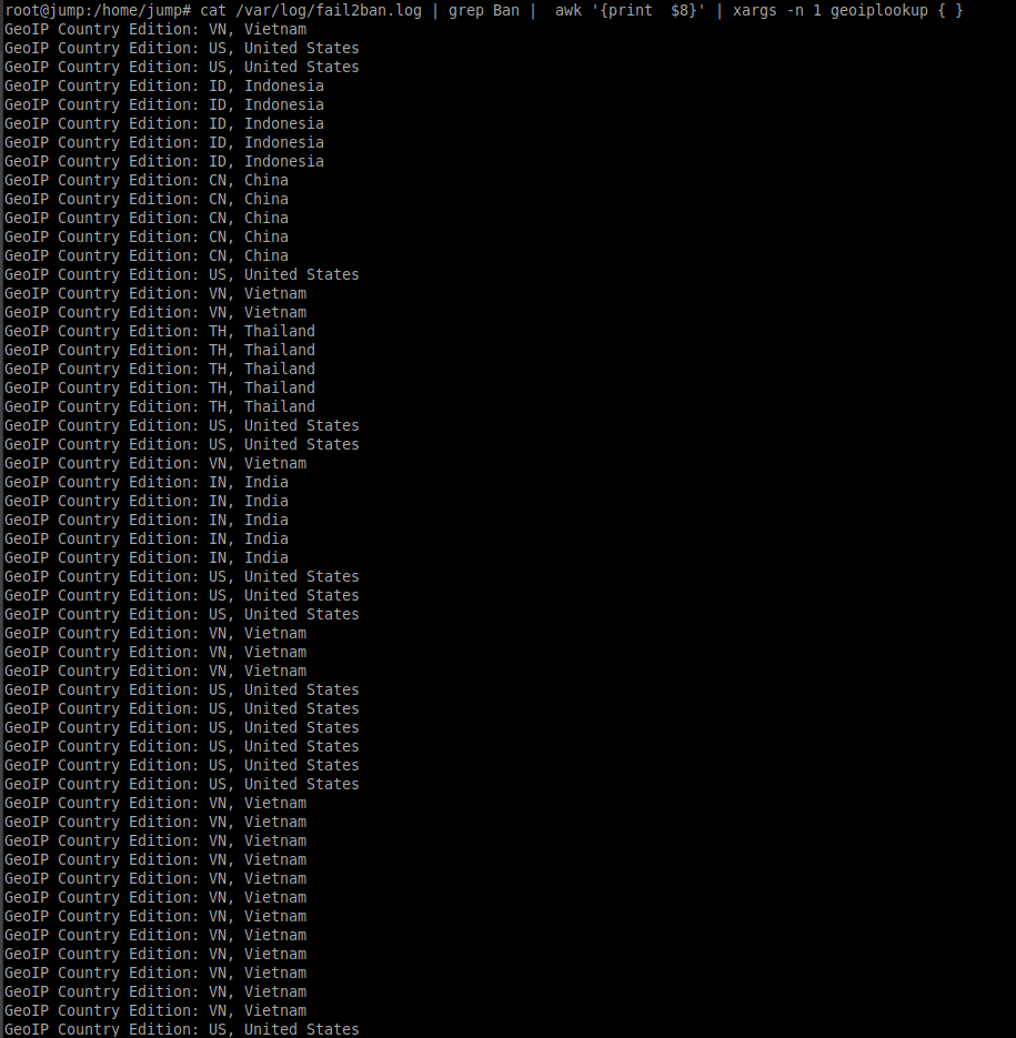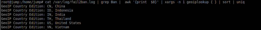 cat /var/log/fail2ban.log | grep Ban | awk '{print $8}' | xargs -n 1 geoiplookup { } | sort | uniq