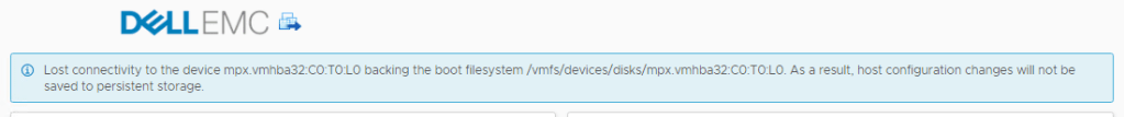 Lost connectivity to the device mpx.vmhba32:C0:T0:L0 backing the boot filesystem /vmfs/devices/disks/mpx.vmhba32:C0:T0:L0. As a result, host configuration changes will not be saved to persistent storage.