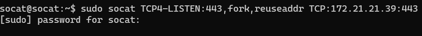 sudo socat TCP4-LISTEN:443,fork,reuseaddr TCP:172.21.21.39:443