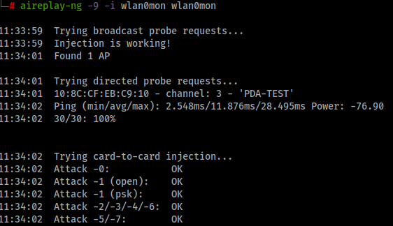 aireplay-ng -9 -i wlan0mon wlan0mon