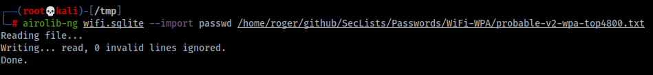 airolib-ng wifi.sqlite --import passwd /home/roger/github/SecLists/Passwords/WiFi-WPA/probable-v2-wpa-top4800.txt