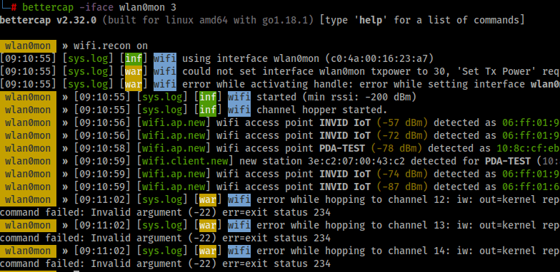 Discover AP. Bettercap for did not put the card in monitormode so before I started bettercap I put the card in monitor mode with airmon start wlan0