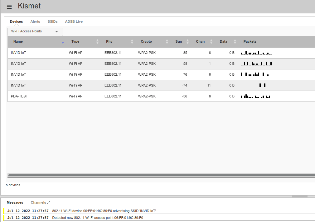 Kismet works with Wi-Fi interfaces, Bluetooth interfaces, some SDR (software defined radio) hardware like the RTLSDR, and other specialized capture hardware.