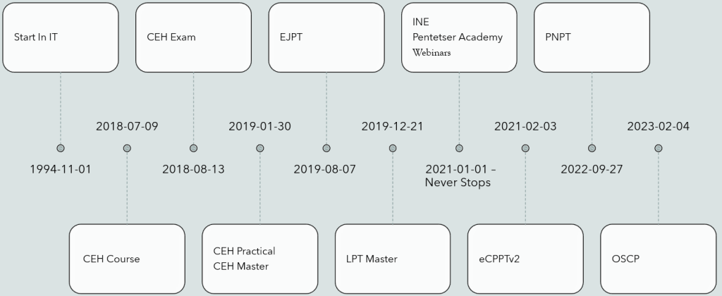 In 2018 I was able to attend CEH in person training, that course change my work life. I was hooked in Security/Hacking. This past year, when I started PNPT and OSCP journey I have done more than 500 hours training in some way, and that almost always done on “spare” time.
